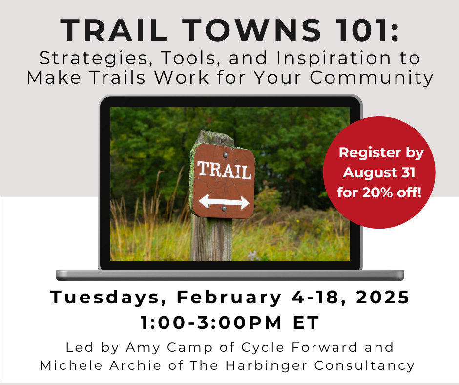 We are offering three 2-hour live video conference sessions plus one-on-one coaching. Trail Towns 101 will help you take the next steps toward unlocking the full potential of your local trails. Use code CycleForward for 10% off the cost of the course on top of the 20% early registration discount!